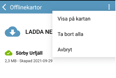 If you press the menu button in the upper right corner, you can choose to show all your downloaded areas on the map. They are then displayed with a purple mark around them. You can also choose to hide all markings of downloaded areas if you previously turned on the function. You can also choose to delete all downloaded map areas.