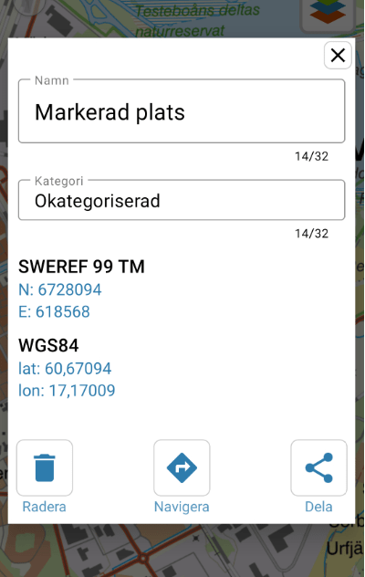 - Coordinates in WGS 84 and SWEREF 99 TM formats.